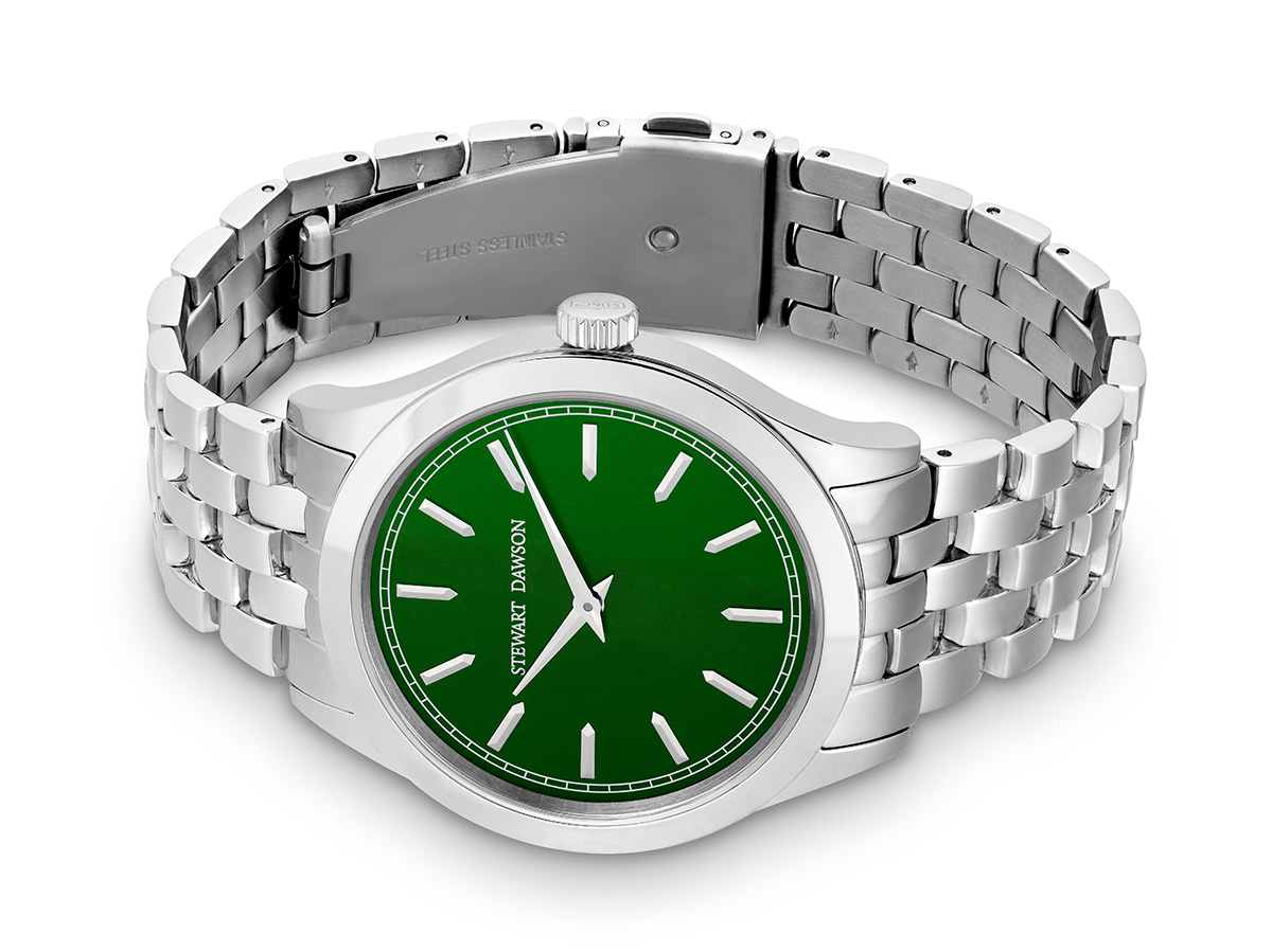 Strap: Metal brachelet in stainless steel 316 L, deployant butterfly buckle with Stewart Dawson logo